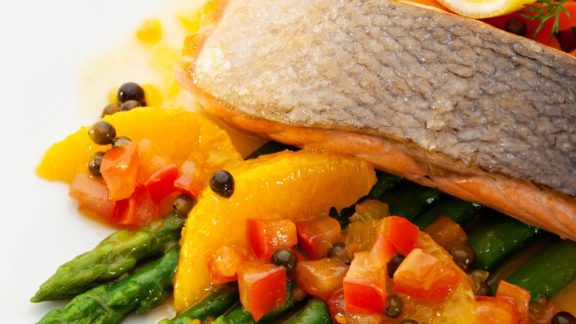 MondayCrispy Citrus Grilled Salmon – Maple Asparagus – Carrot Puree – Dinner Salad