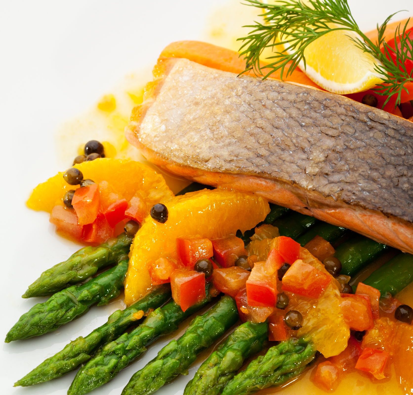 Crispy Skin On Citrus Salmon, Grilled Maple Asparagus, Carrot Puree, Citrus Chutney, Dinner Salad